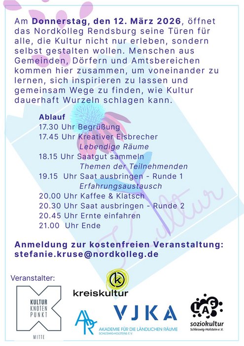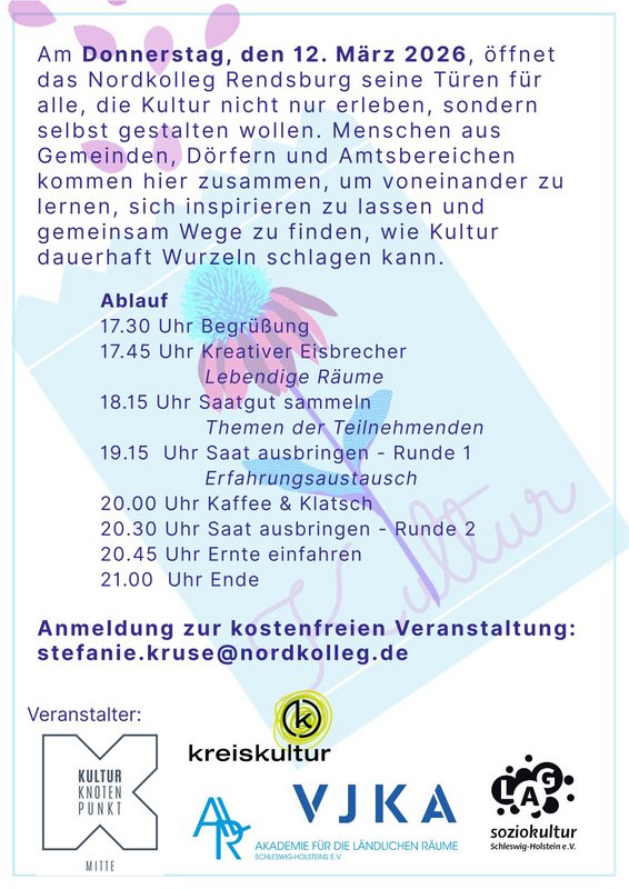 Am 12. März 2026, öffnet das Nordkolleg seine Türen für alle, die Kultur nicht nur erleben, sondern selbst gestalten wollen. Menschen aus Gemeinden, Dörfern und Amtsbereichen kommen hier zusammen, um voneinander zu lernen, sich inspirieren zu lassen und gemeinsam Wege zu finden, wie Kultur dauerhaft Wurzeln schlagen kann.