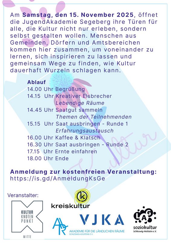 Am Samstag, den 15. November 2025, öffnet die JugendAkademie Segeberg ihre Türen für alle, die Kultur nicht nur erleben, sondern selbst gestalten wollen. Menschen aus Gemeinden, Dörfern und Amtsbereichen kommen hier zusammen, um voneinander zu lernen, sich inspirieren zu lassen und gemeinsam Wege zu finden, wie Kultur dauerhaft Wurzeln schlagen kann.